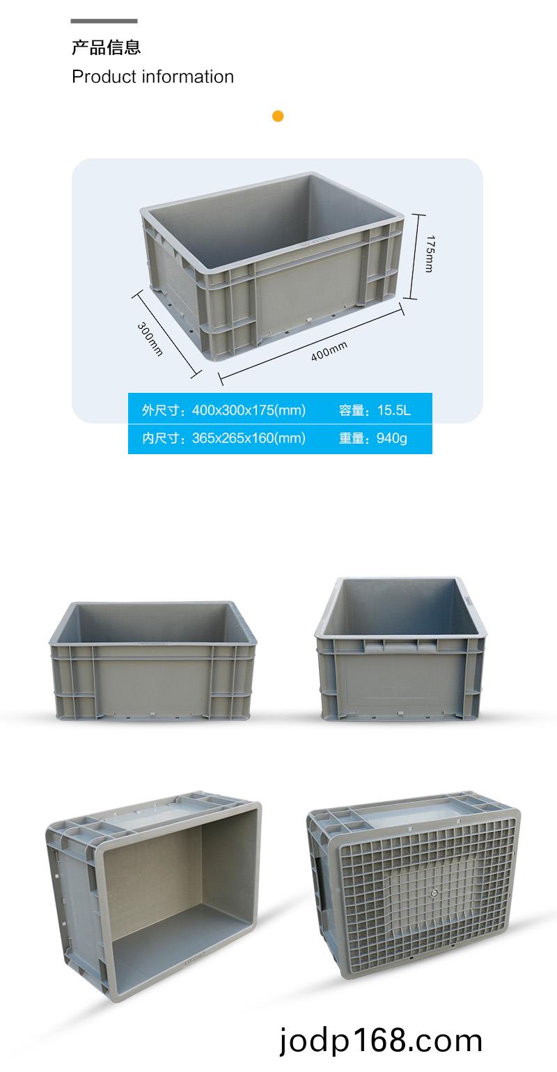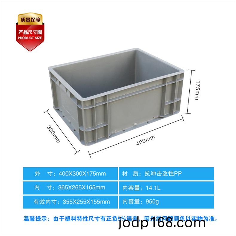 外尺寸:400X300X175mm 內尺(chi)寸(cun):365X265X160mm 材質:抗(kang)衝擊改性PP 重量:0.94kg