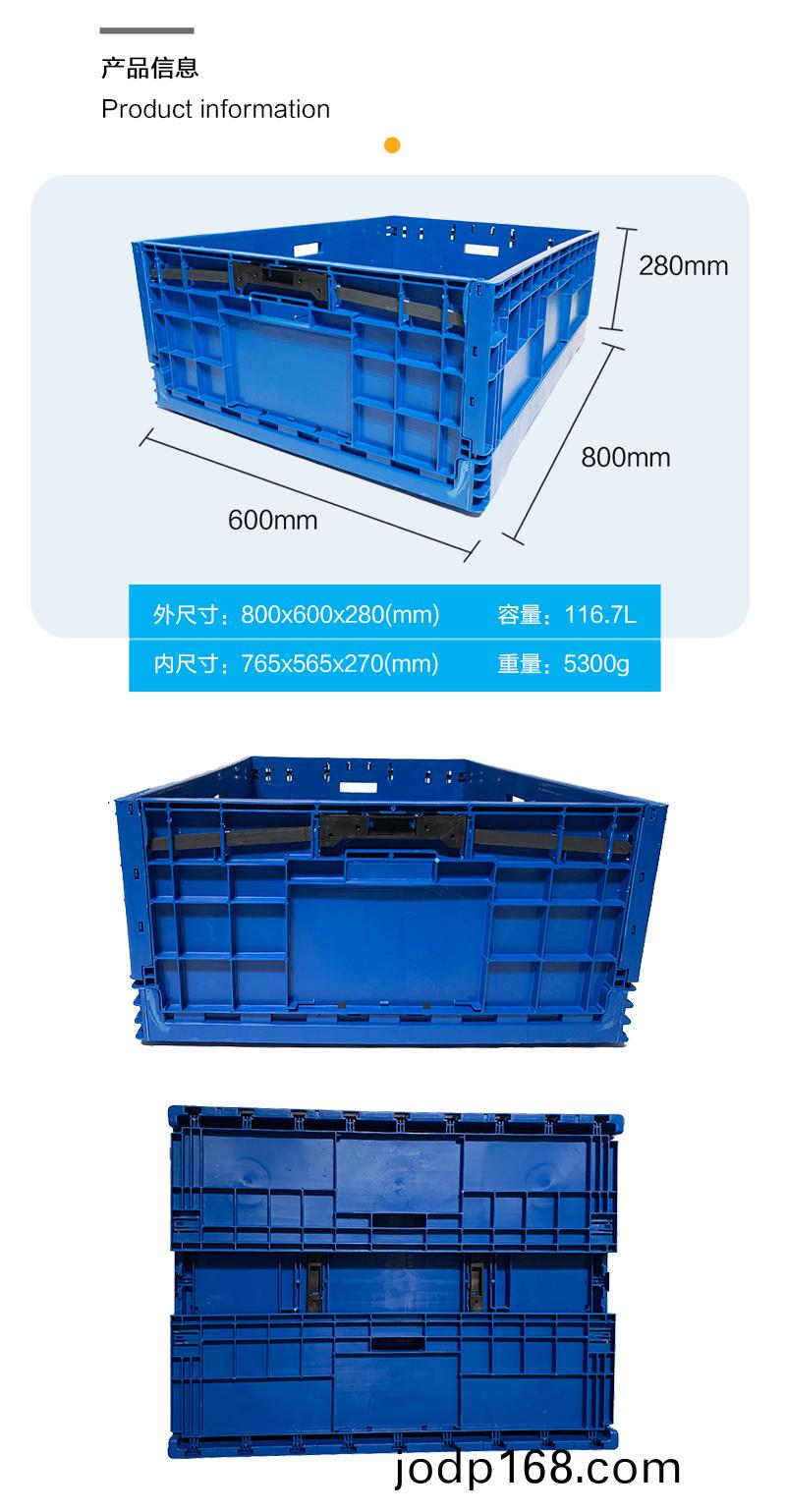 外尺寸:800*600*280mm 內尺寸:765*565*270mm 材質:PP 重量:5300g