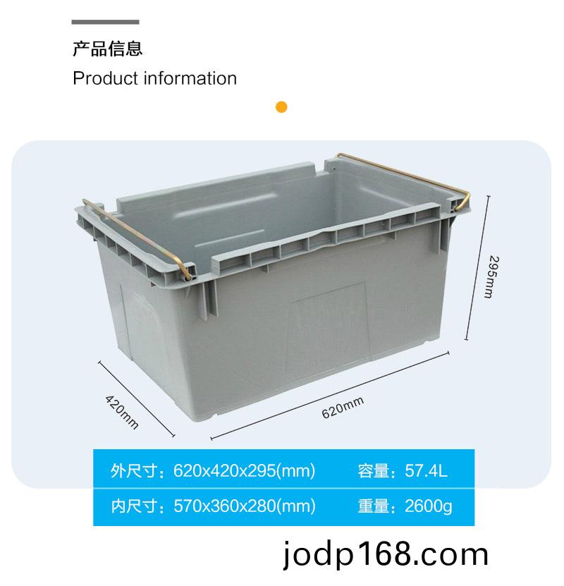 外尺寸:620*425*295mm 內尺寸:570*370*280mm 材質:PP 重量:2600g