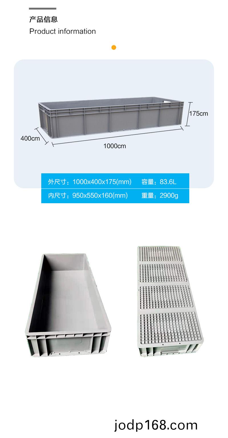 外尺寸:1000*400*175mm 內尺寸:950*350*160mm 材(cai)質:PP 重量(liang):2900g
