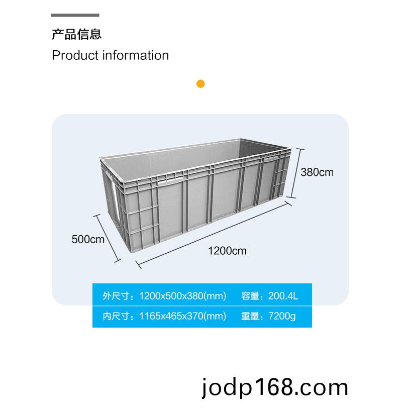 外尺寸:1200*500*380mm 內尺寸:1165*465*370mm 材(cai)質:PP 重量:7200g