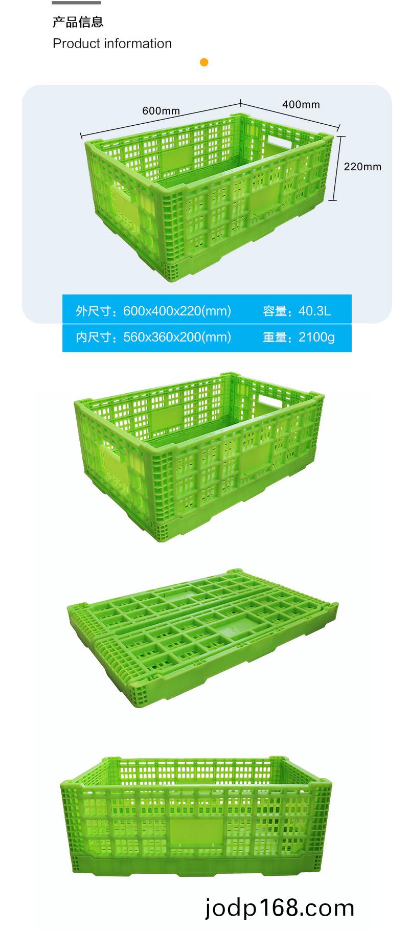 外尺寸:600*400*220mm 內尺(chi)寸:600*400*220mm 材(cai)質:PP 重量(liang):2100g