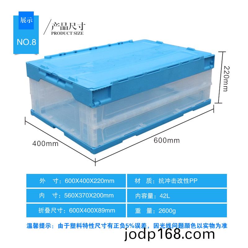 外尺(chi)寸:600×400×220mm 內尺寸:560×370×195mm 材質(zhi):PP 重量(liang):1970g