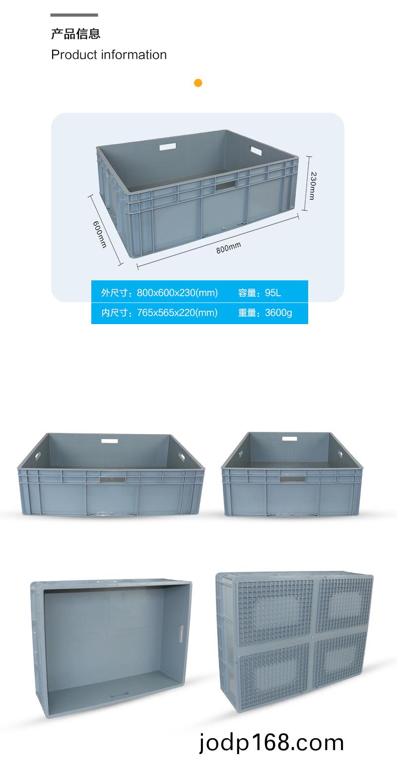 外尺寸:800*600*230mm 內(nei)尺寸:765*565*220mm 材質:PP 重量:3250g