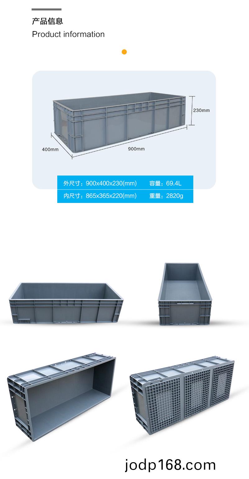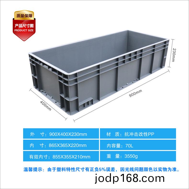 外(wai)尺寸:900X400X230mm 內尺寸:865X365X220mm 材質(zhi):抗衝擊改性PP 重量:2.82kg