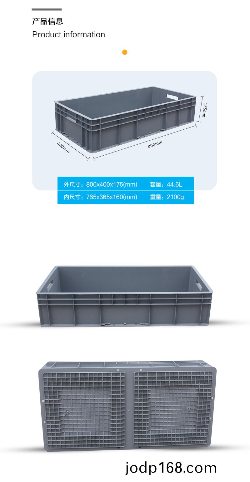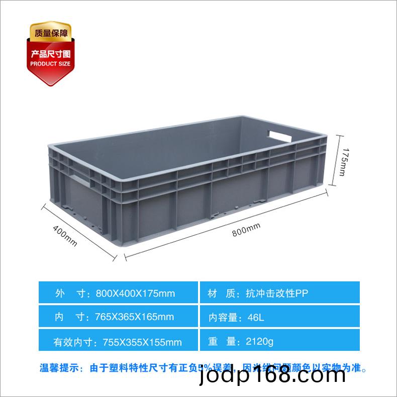 外尺寸:800X400X175mm 內尺寸:765X365X160mm 材質(zhi):抗(kang)衝擊(ji)改性(xing)PP 重量:2.05kg