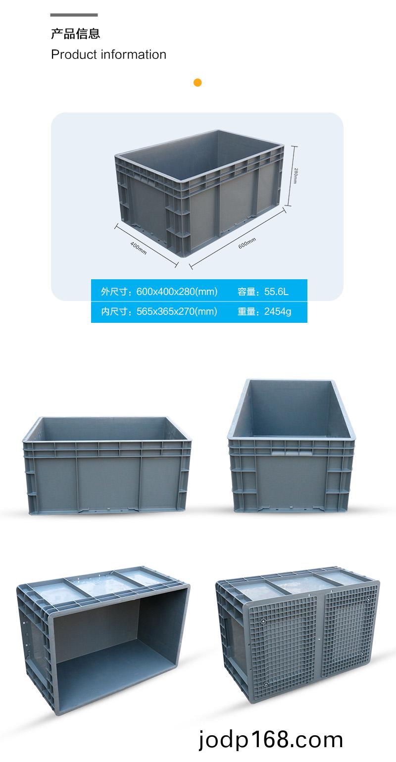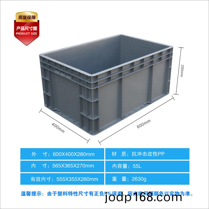 外尺寸:600X400X280mm 內尺寸:565X365X270mm 材質:抗衝擊改性PP 重量:2.6kg