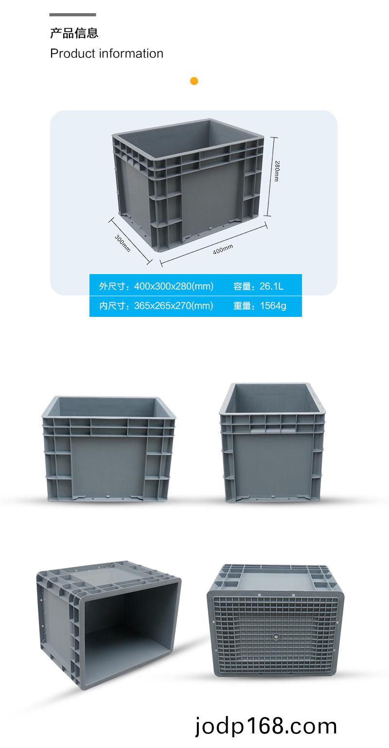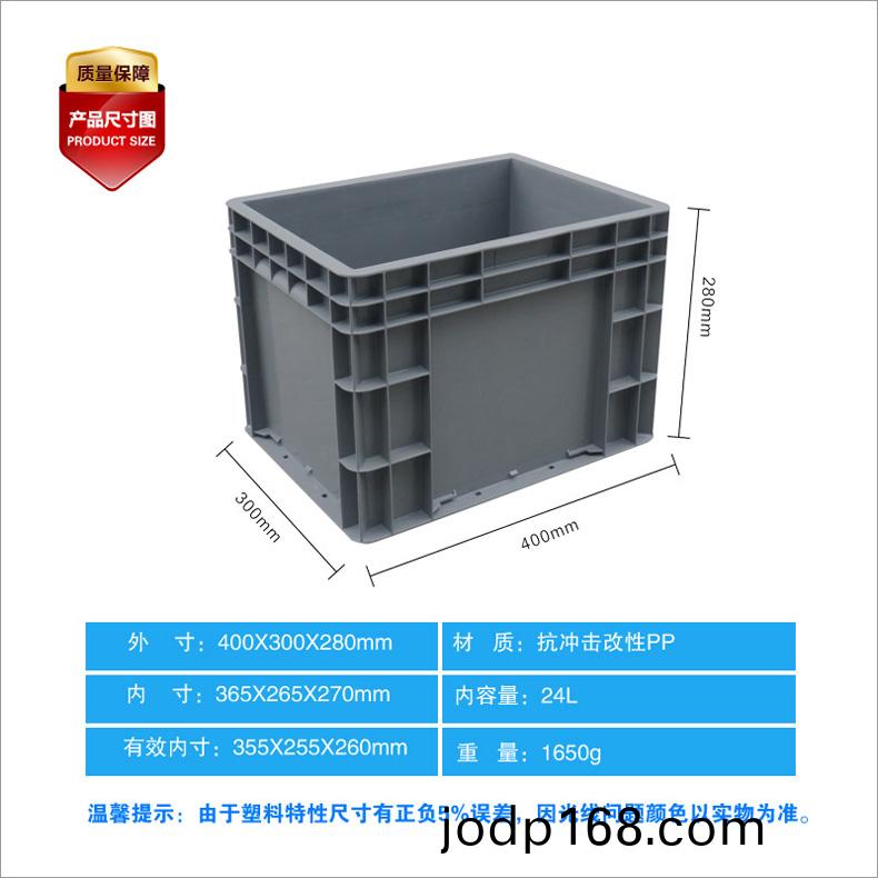 外尺寸:400X300X280mm 內尺寸:465X265X270mm 材質:抗衝擊(ji)改(gai)性PP 重量:1.6kg