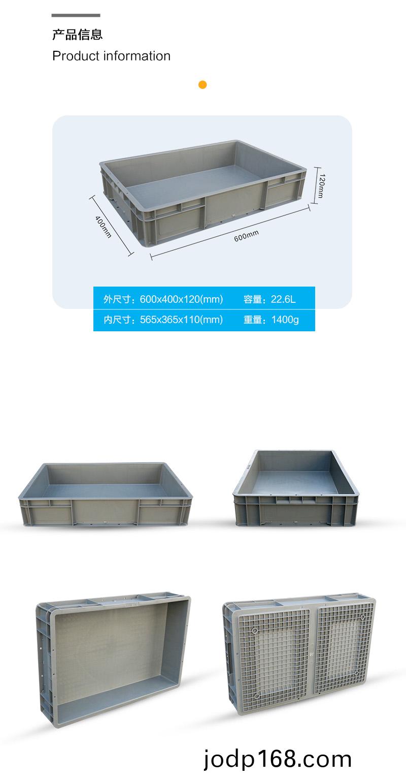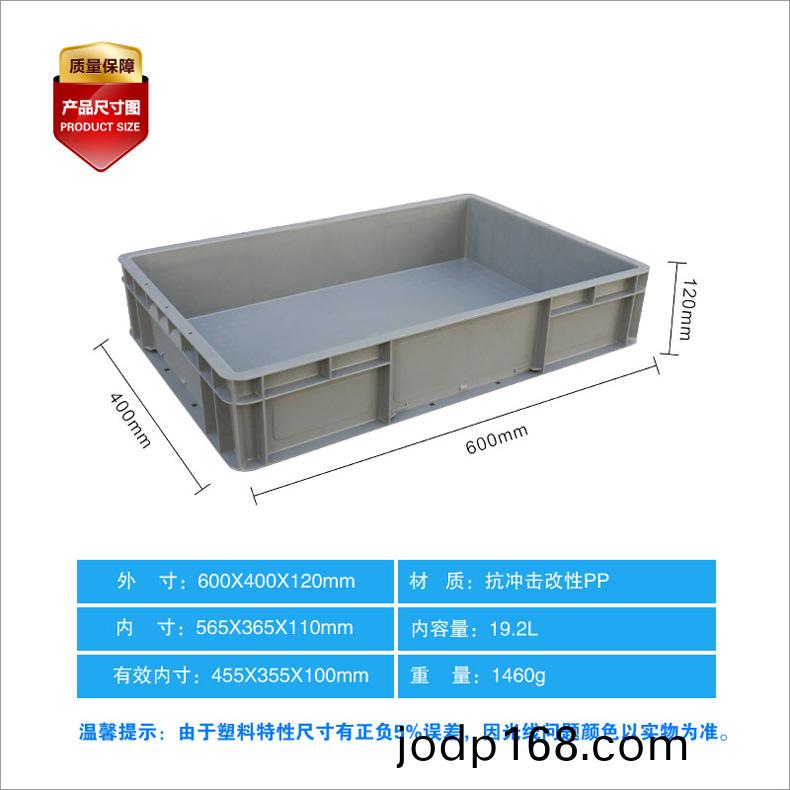 外尺(chi)寸:600X400X120mm 內尺寸:565X365X110mm 材(cai)質(zhi):抗衝擊改性PP 重量:2.6kg